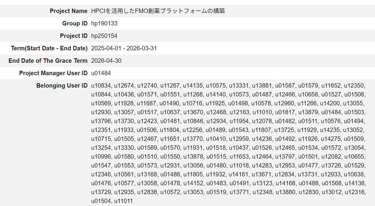 富岳ポータルから見れる、本課題の参加者リストを確認しましたが、u14241は確認できませんでした。(下記画像)FAASからは本課題への連携は登録されているように見受けられますが、