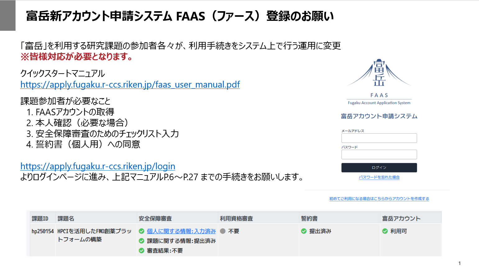 課題との紐づけが完了されている場合、FAASログイン後の画面にて、下記画像の下段のように、hp250154課題の富岳アカウントが「利用可」となります。利用可になっていない場合、課題との紐づけが完了していない可能性がございます。・アカウントとグループ(課題)の紐づけのタイムラグ